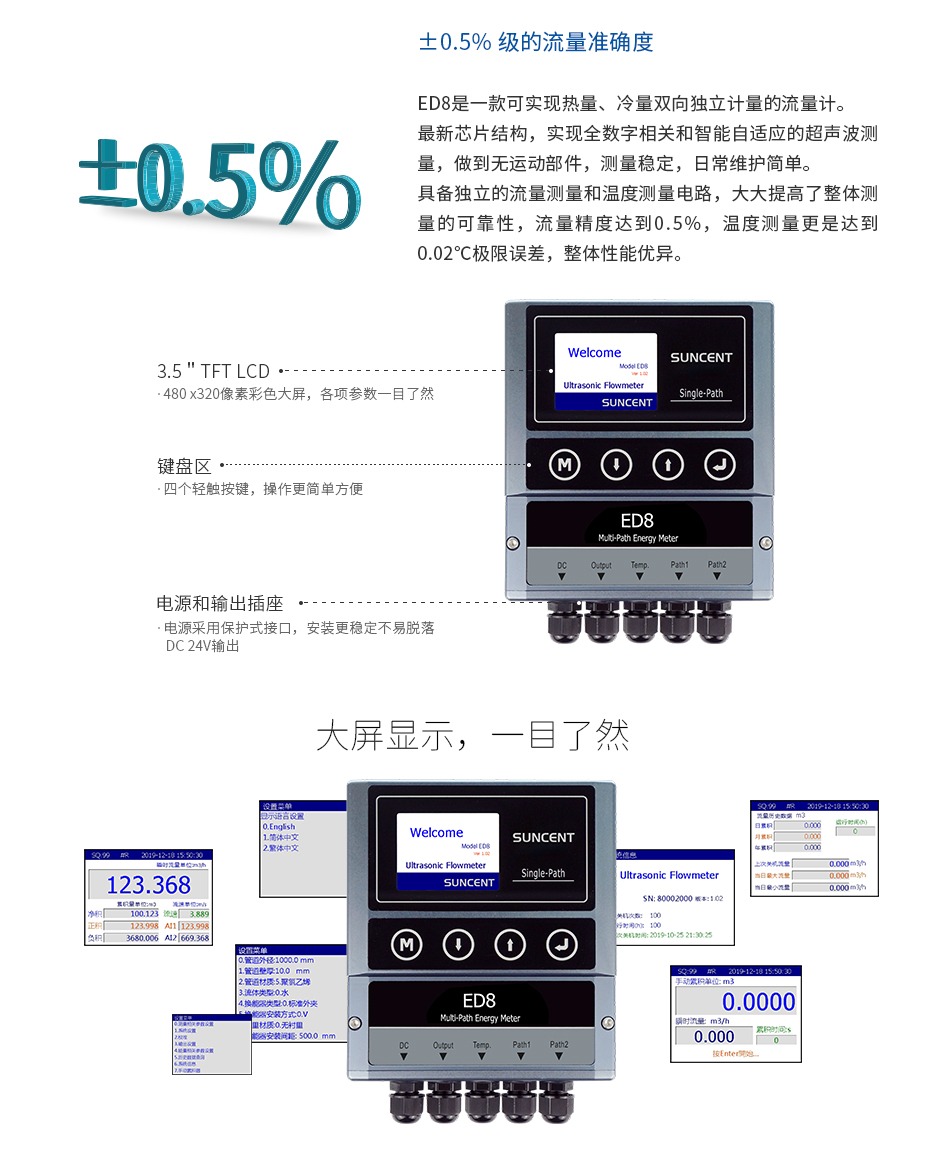 · 具備獨?的流量測量和溫度測量電路,??提?整體測量的可靠性,流量精度可以達到0.5%,溫度測量更是達到0.02℃極限誤差,整體性能優異。
